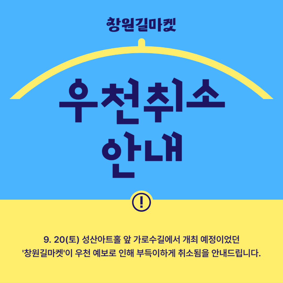 9월 20일(토) 성산아트홀 앞 가로수길에서 개최 예정이었던 창원길마켓이 우천 예보로 인해 취소됨을 알려드립니다. |